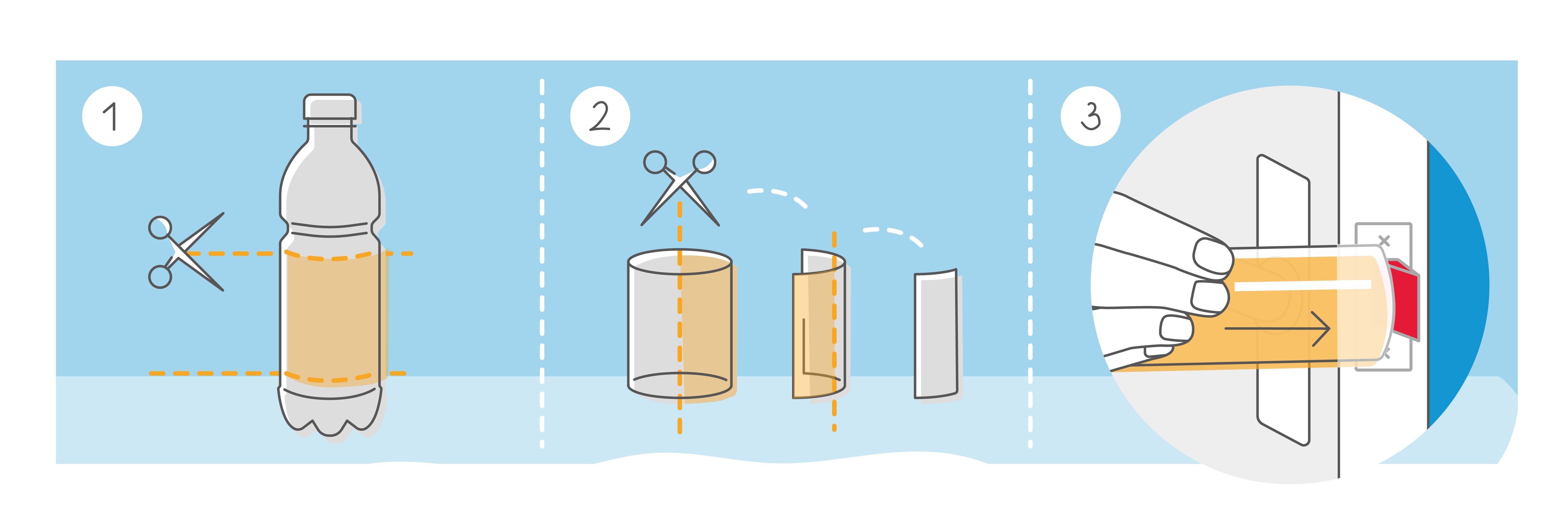 Ähnlich wie die Kreditkarten-Methode funktioniert ein Streifen aus Plastikflasche. Schneide den Zylinder einer Plastik-Einwegflasche heraus (oben und unten abtrennen, dann aufschneiden), sodass du ein flexibles Stück Kunststoff hast. Dieses Stück faltest oder rollst du längs, bis du es auf Höhe des Schlosses in den Türspalt schieben kannst. Im Grunde schiebst du damit ebenfalls den Schnapper zurück wie mit der Karte.