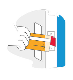 Du kannst versuchen, die Karte oberhalb des Türgriffs seitlich zwischen Tür und Rahmen zu stecken und sie dann nach unten in Richtung Schloss ziehen. Mit etwas Glück schnellt der Schnapper zurück und die Tür springt auf.