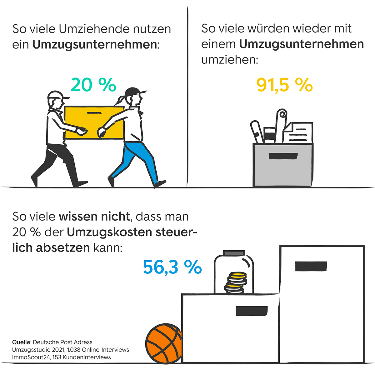 Eine Umfrage unter Nutzer:innen von ImmoScout24 ergab, dass 91,5 Prozent all derjenigen, die ein Umzugsunternehmen schonmal genutzt haben, es auch weiterempfehlen würden. Trotzdem haben laut der Umzugsstudie 2021 der Deutschen Post bisher nur 20 Prozent auf die Hilfe von Profis zurückgegriffen.
