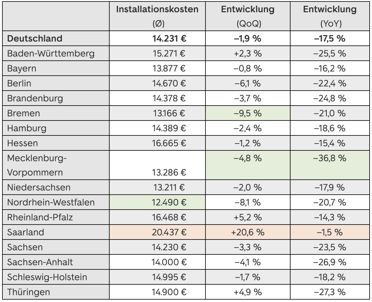 In Mecklenburg-Vorpommern kosten Komplettanlagen ein Drittel weniger als noch vor einem Jahr (–36,8 Prozent). Auch in Thüringen (–27,3 Prozent) und Baden-Württemberg (–25,5 Prozent) zeigt sich eine ausgeprägte Preisreduktion. Bei Komplettsystemen fällt der Rückgang im Saarland mit –1,5 Prozent deutlich schwächer aus als im Bundesdurchschnitt.